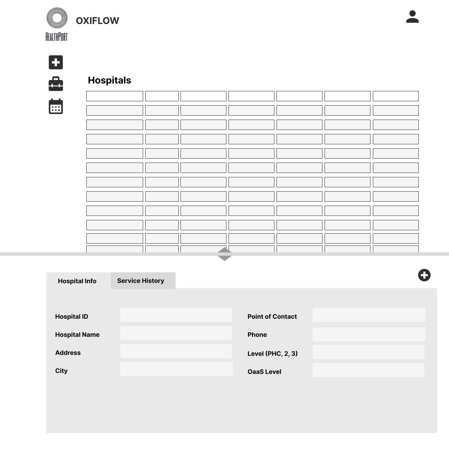 A 3 part interface consisting of dashboard of oxygen availability for users, a data entry form for clinical support staff, and a backend summary table to track patient and equipment data.