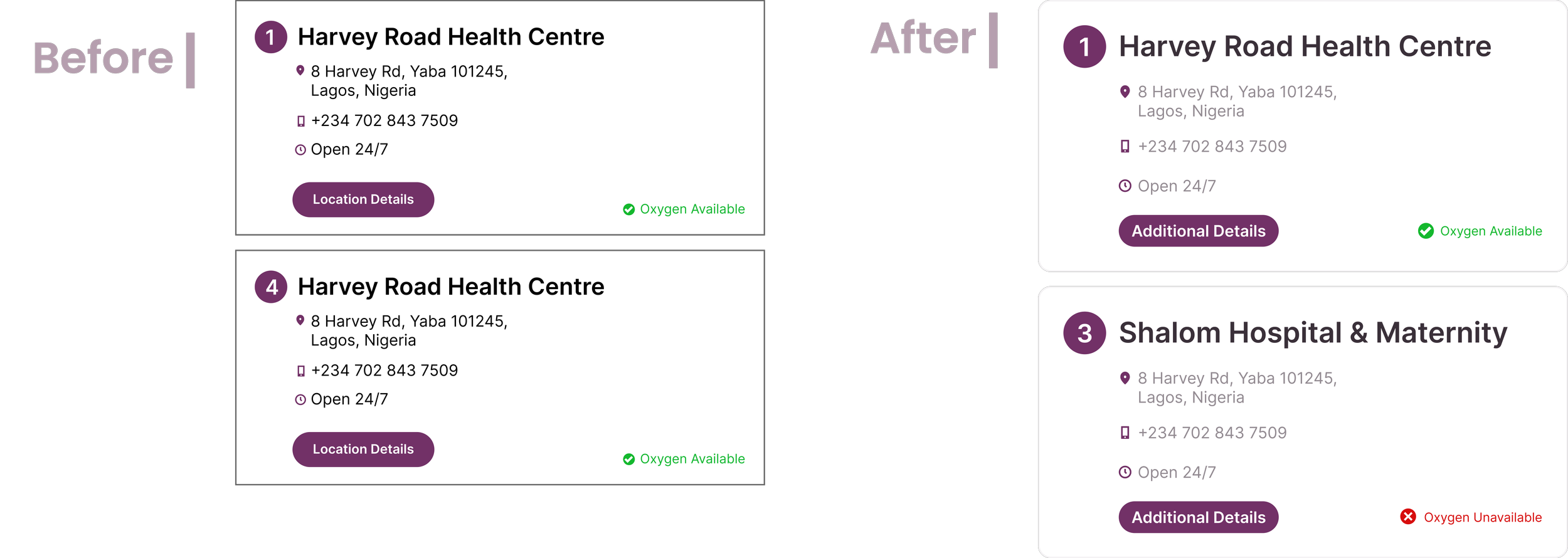 All users were able to fully complete the task of finding a hospital with oxygen. The largest instance of hesitation among users centered around the “Location Details” CTA. We changed the verbiage to “Additional Details” to give users a better idea of what information they will be getting by clicking the button.