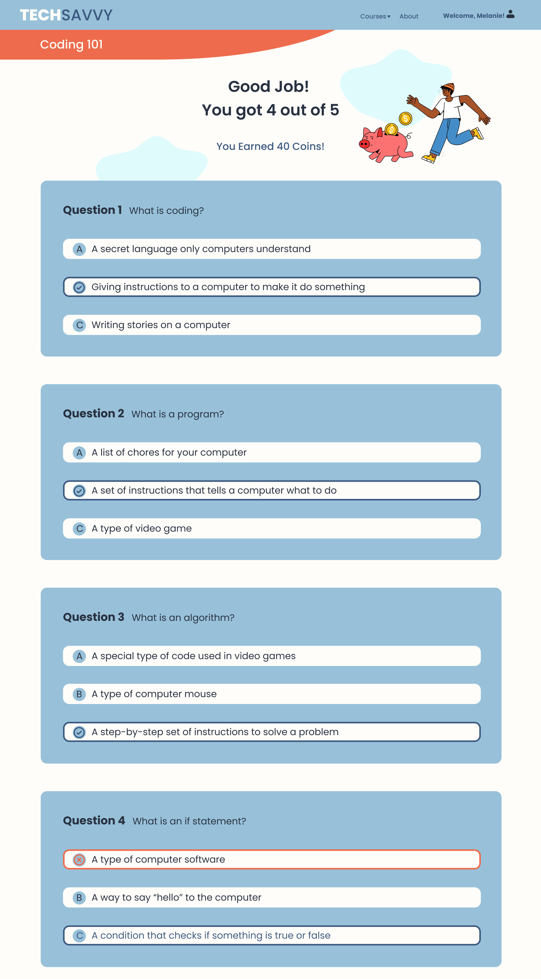 More Incentive for Coins: Currently, the only incentive for getting through lessons and gaining coins is for users to be on the leaderboard. As we continue to develop out this idea, we would like to add other incentives for coins. This could be anywhere from unlocking levels to a virtual store where you can “buy” things with your coins.